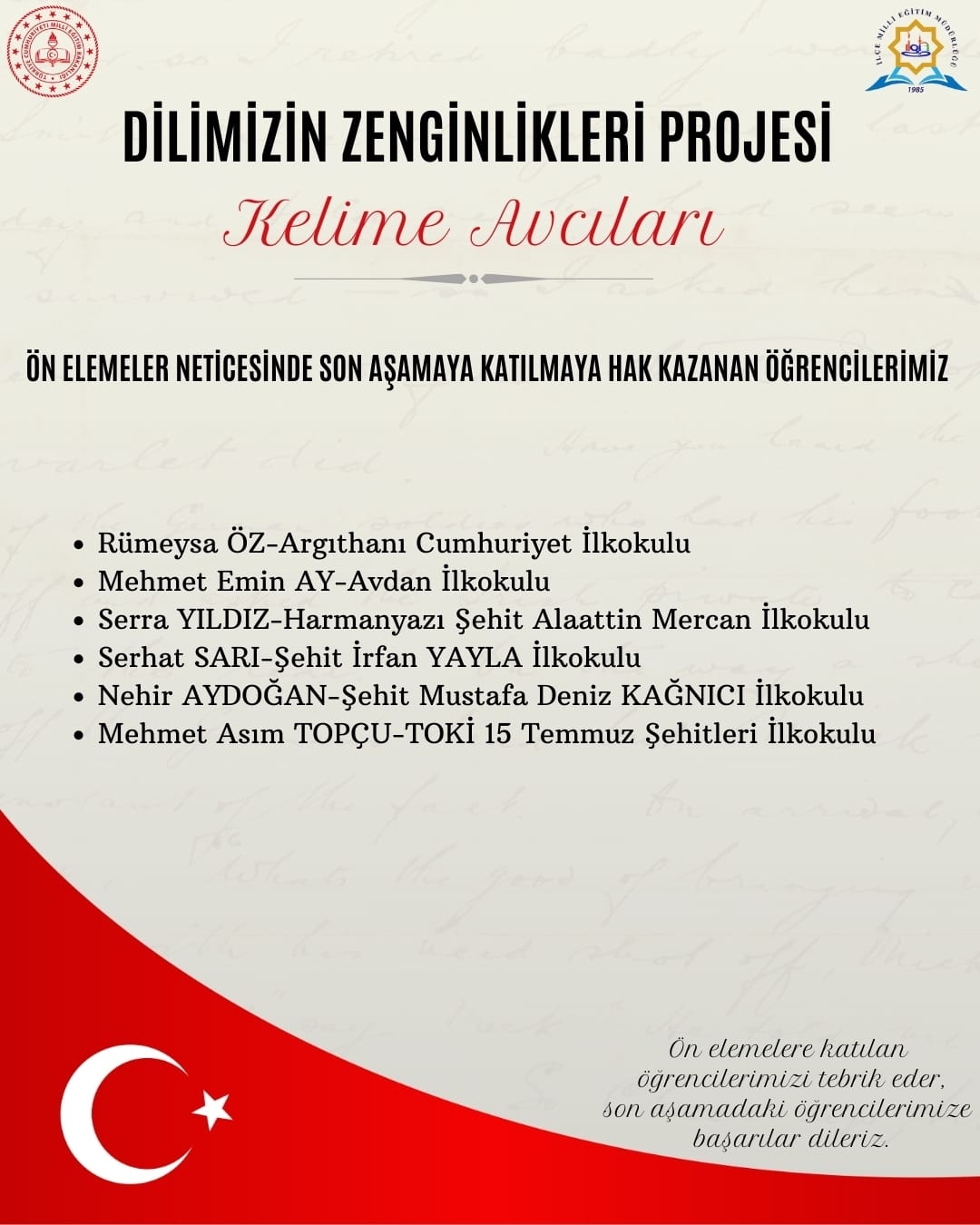 Milli Eğitim Bakanlığı tarafından yürütülen Dilimizin Zenginlikleri Projesi kapsamında İlçe Milli Eğitim Müdürlüğümüz ile Ilgın Gençlik Merkezi'nin ortaklaşa gerçekleştirdiği ilkokullar arası Kelime Avcıları yarışmasının ilk aşaması tamamlanmıştır.