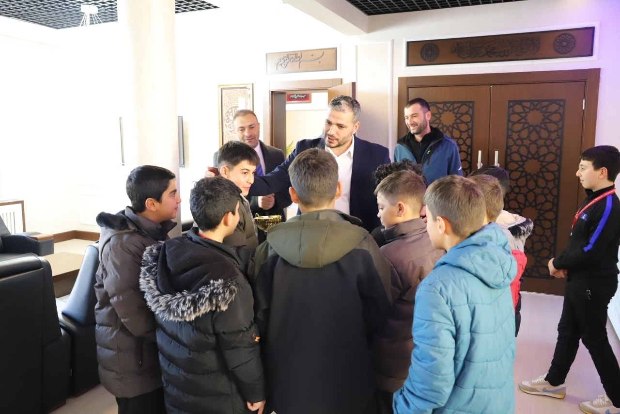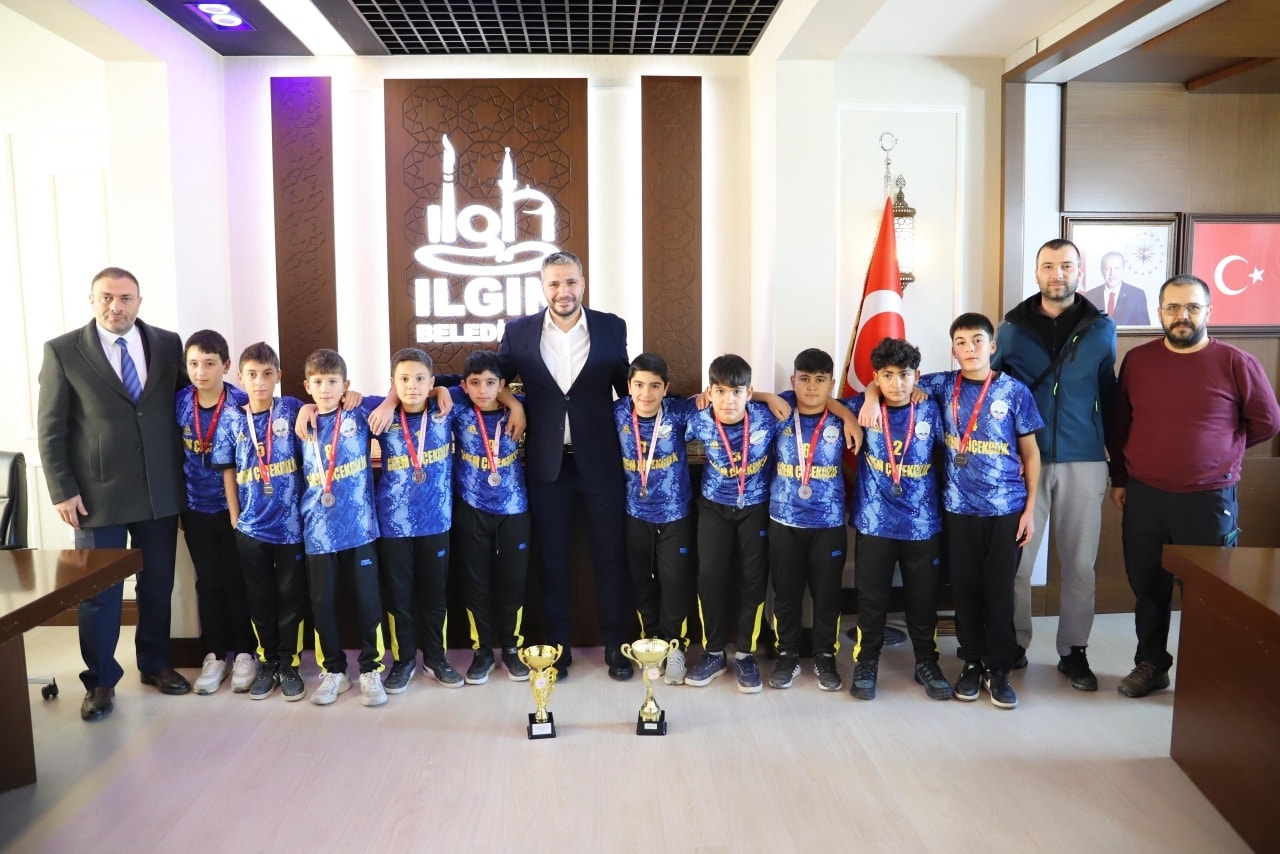 İlçe Milli Eğitim Müdürümüz Sn. Olcay Günay beraberinde, Konya'da düzenlenen Küçük Erkekler Voleybol müsabakalarında 2. olarak Türkiye Bölge Müsabakalarına katılmaya hak kazanan Şehit Ziya Mert Ortaokulu öğrencileri, Okul Müdürü Mevlüt Çam ve Beden Eğitimi öğretmenleri Veli Can Koç ile Belediye Başkanımız Sn. Ömer Apil'i ziyaret etti.